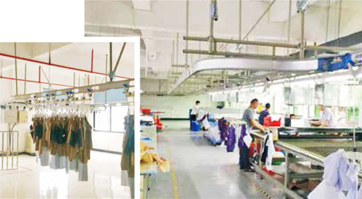 后道手动吊挂系统,车间整洁、搬运灵活,快出成品,降低后道积压,工序调整灵活,整个流程产品不落地,提升产品品质、降低劳动。