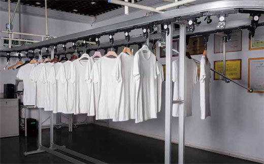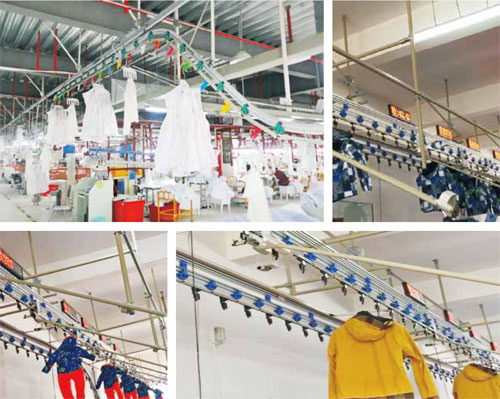 该产品为新型后道自动吊挂系统,内置软件控制系统,具有操作简单,快出成品,工位智能配送,订单调整灵活,效率提升明显等特点。