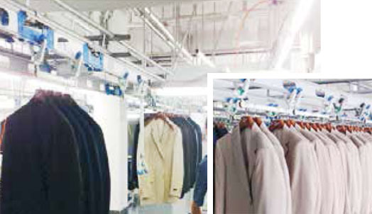 轨道式传输,独立存储,裁片吊挂,流水加工,适合多品种小批量,私人高级定制,联网定制服装裁剪模式。