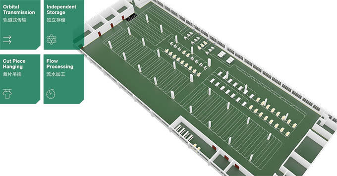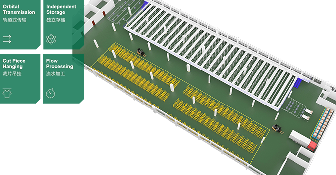 裁剪车间分有仓储系统、裁剪系统和裁片加工区,通过裁片加工区到裁片超市,用裁片吊挂系统输送到缝制车间。